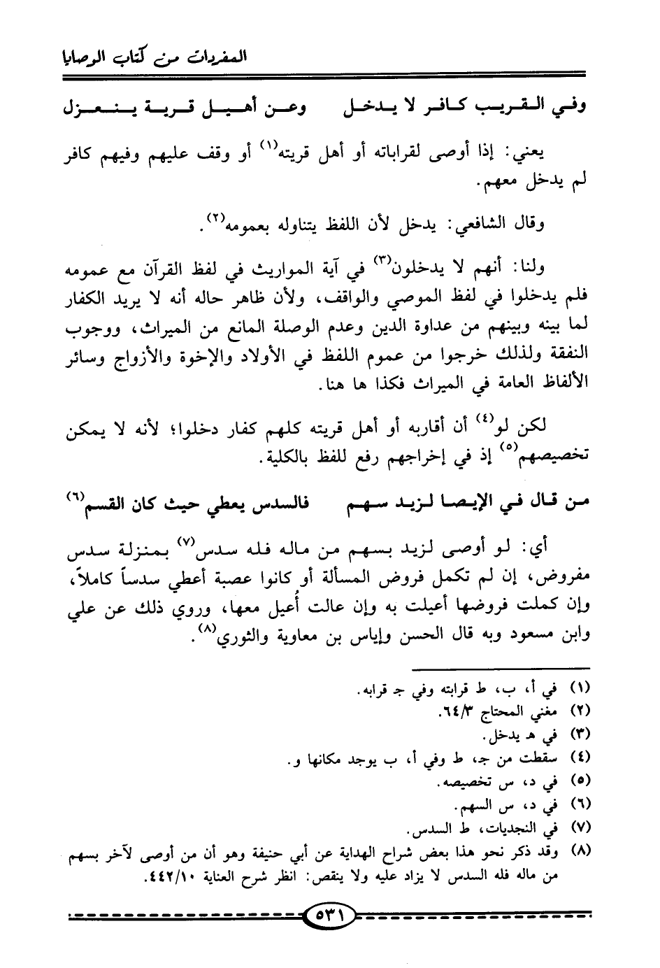 (¬8) وقد ذكر نحو هذا بعض شراح الهداية عن أبي حنيفة وهو أن من أوصى لآخر بسهم من ماله فله السدس لا يزاد عليه ولا يقص: انظر شرح العناية 10/ 442.