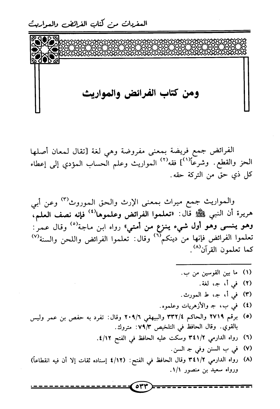 والمواريث جمع ميراث بمعنى الإرث والحق الموروث (¬3) وعن أبي هريرة أن النبي - صلى الله عليه وسلم - قال: "تعلموا الفرائض وعلموها (¬4) فإنه نصف العلم، وهو ينسى وهو أول شيء ينزع من أمتي" رواه ابن ماجة (¬5) وقال عمر: تعلموا الفرائض فإنها من دينكم (¬6) وقال: تعلموا الفرائض واللحن والسنة (¬7) كما تعلمون القرآن (¬8).