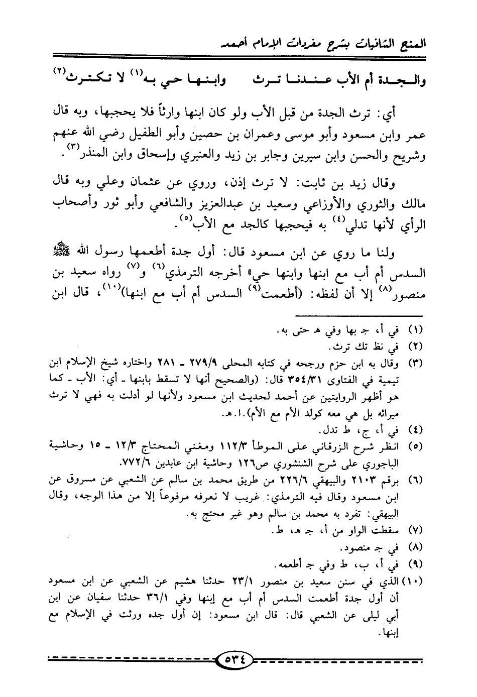 (¬10) الذي في سنن سعيد بن منصور 1/ 23 حدثنا هشيم عن الشعبي عن ابن مسعود أن أول جدة أطعمت السدس أم أب مع إبنها وفي 1/ 36 حدثنا سفيان عن ابن أبي ليلى عن الشعبي قال: قال ابن مسعود: إن أول جده ورثت في الإِسلام مع إبنها.