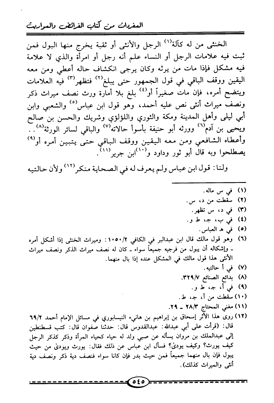 (¬12) روى هذا الأثر إسحاق بن إبراهيم بن هانئ النيسابوري في مسائل الإِمام أحمد 2/ 69 قال: (قرأت على أبي عبد الله: عبد القدوس قال: حدثنا صفوان قال: كتب قسطنطين إلى عبد الملك بن مروان يسأله عن صبي ولد له حياء كحياء المرأة وذكر كذكر الرجل كيف يورث؟ وكيف يودى؟ فسأل ابن عباس عن ذلك فقال: يورث ويودى من حيث يبول فإن بال منهما جميعًا فمن حيث بدر فإن كانا سواء فنصف دية ذكر ونصف دية أنثى والميراث كذلك).