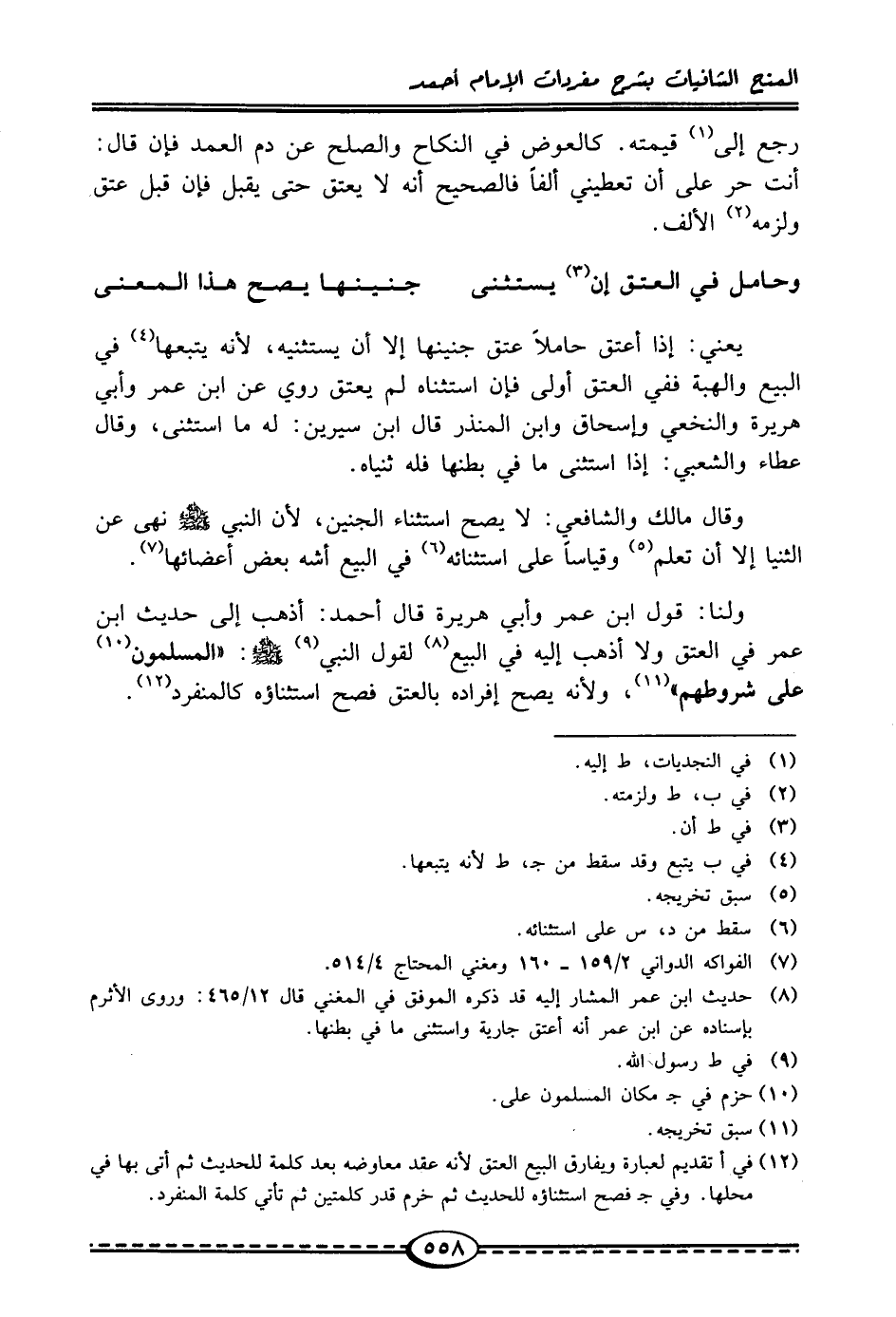 (¬8) حديث ابن عمر المشار إليه قد ذكره الموفق في المغني قال 12/ 465: وروى الأثرم بإسناده عن ابن عمر أنه أعتق جارية واستثنى ما في بطنها.
