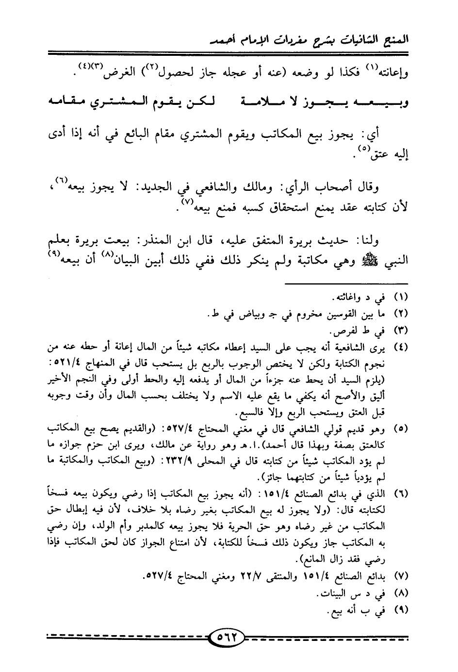 (¬6) الذي في بدائع الصنائع 4/ 151: (أنه يجوز بيع المكاتب إذا رضي ويكون بيعه فسخًا لكتابته قال: (ولا يجوز له بيع المكاتب بغير رضاه بلا خلاف، لأن فيه إبطال حق المكاتب من غير رضاه وهو حق الحرية فلا يجوز بيعه كالمدبر وأم الولد، وإن رضي به المكاتب جاز ويكون ذلك فسخًا للكتابة، لأن امتناع الجواز كان لحق المكاتب فإذا رضي فقد زال المانع).