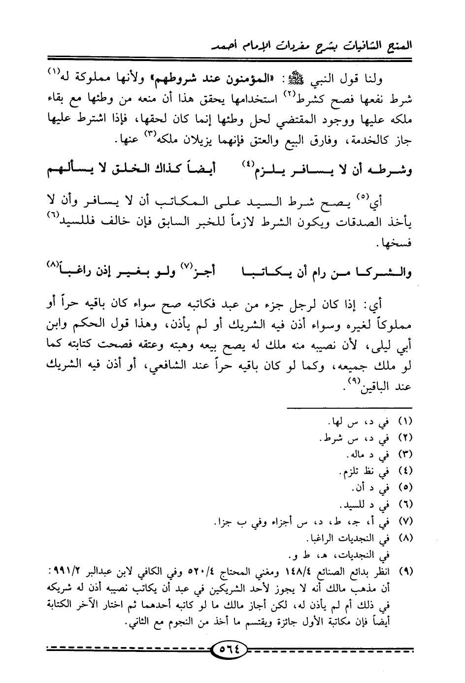 (¬9) انظر بدائع الصنائع 4/ 148 ومغني المحتاج 4/ 520 وفي الكافي لابن عبد البر 2/ 991: أن مذهب مالك أنه لا يجوز لأحد الشريكين في عبد أن يكاتب نصيبه أذن له شريكه في ذلك أم لم يأذن له، لكن أجاز مالك ما لو كاتبه أحدهما ثم اختار الآخر الكتابة أيضًا فإن مكاتبة الأول جائزة ويقتسم ما أخذ من النجوم مع الثاني.