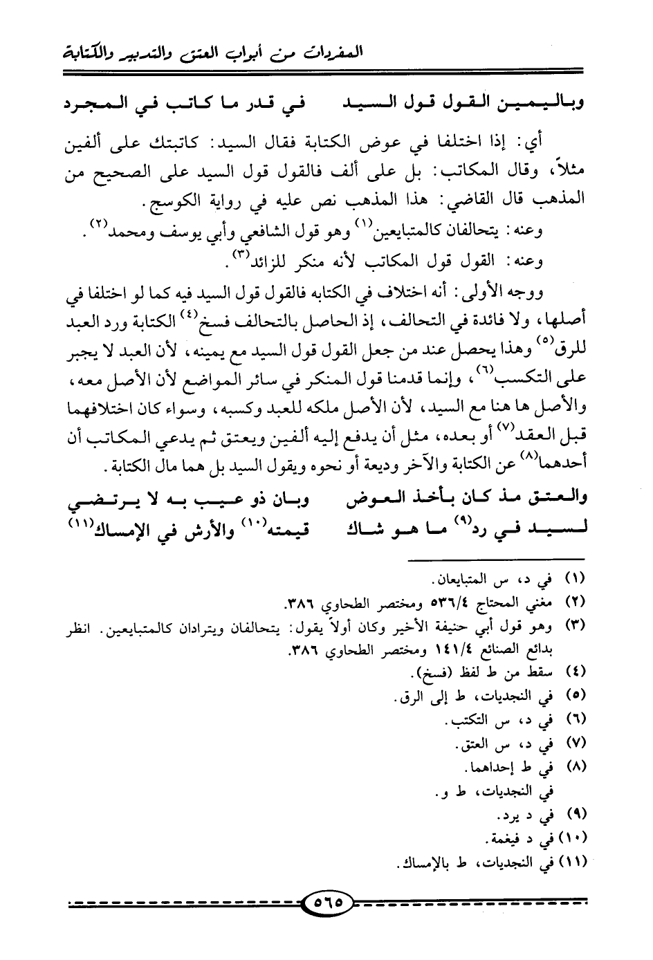 وباليمين القول قول السيد ... في قدر ما كاتب في المجرد