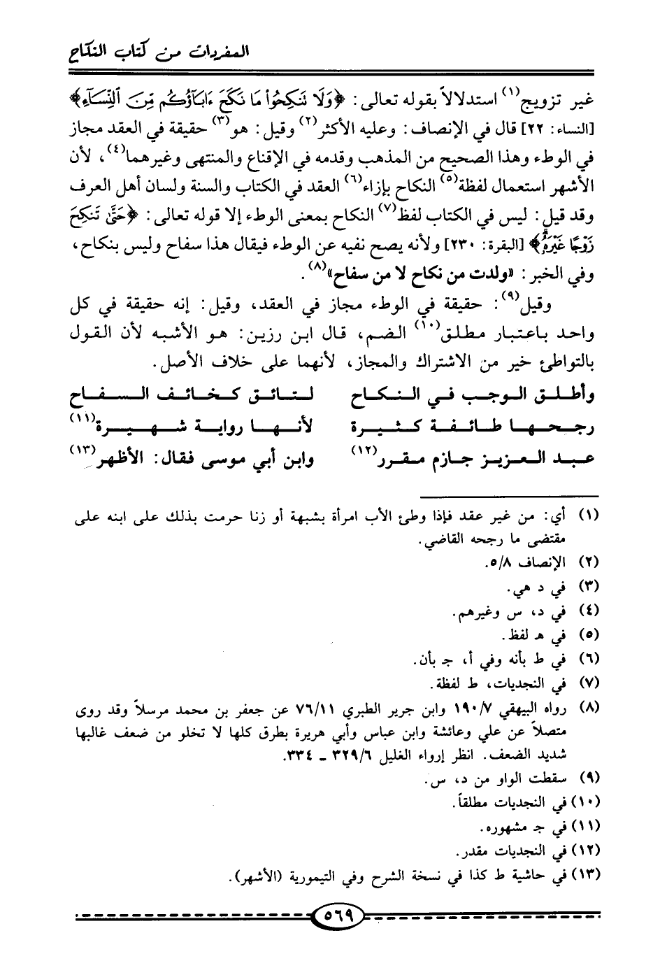 غير تزويج (¬1) استدلالًا بقوله تعالى: {وَلَا تَنْكِحُوا مَا نَكَحَ آبَاؤُكُمْ مِنَ النِّسَاءِ} [النساء: 22] قال في الإنصاف: وعليه الأكثر (¬2) وقيل: هو (¬3) حقيقة في العقد مجاز في الوطء وهذا الصحيح من المذهب وقدمه في الإقناع والمنتهى وغيرهما (¬4)، لأن الأشهر استعمال لفظة (¬5) النكاح بإزاء (¬6) العقد في الكتاب والسنة ولسان أهل العرف وقد قيل: ليس في الكتاب لفظ (¬7) النكاح بمعنى الوطء إلا قوله تعالى: {حَتَّى تَنْكِحَ زَوْجًا غَيْرَهُ} [البقرة: 230] ولأنه يصح نفيه عن الوطء فيقال هذا سفاح وليس بنكاح، وفي الخبر: "ولدت من نكاح لا من سفاح" (¬8).