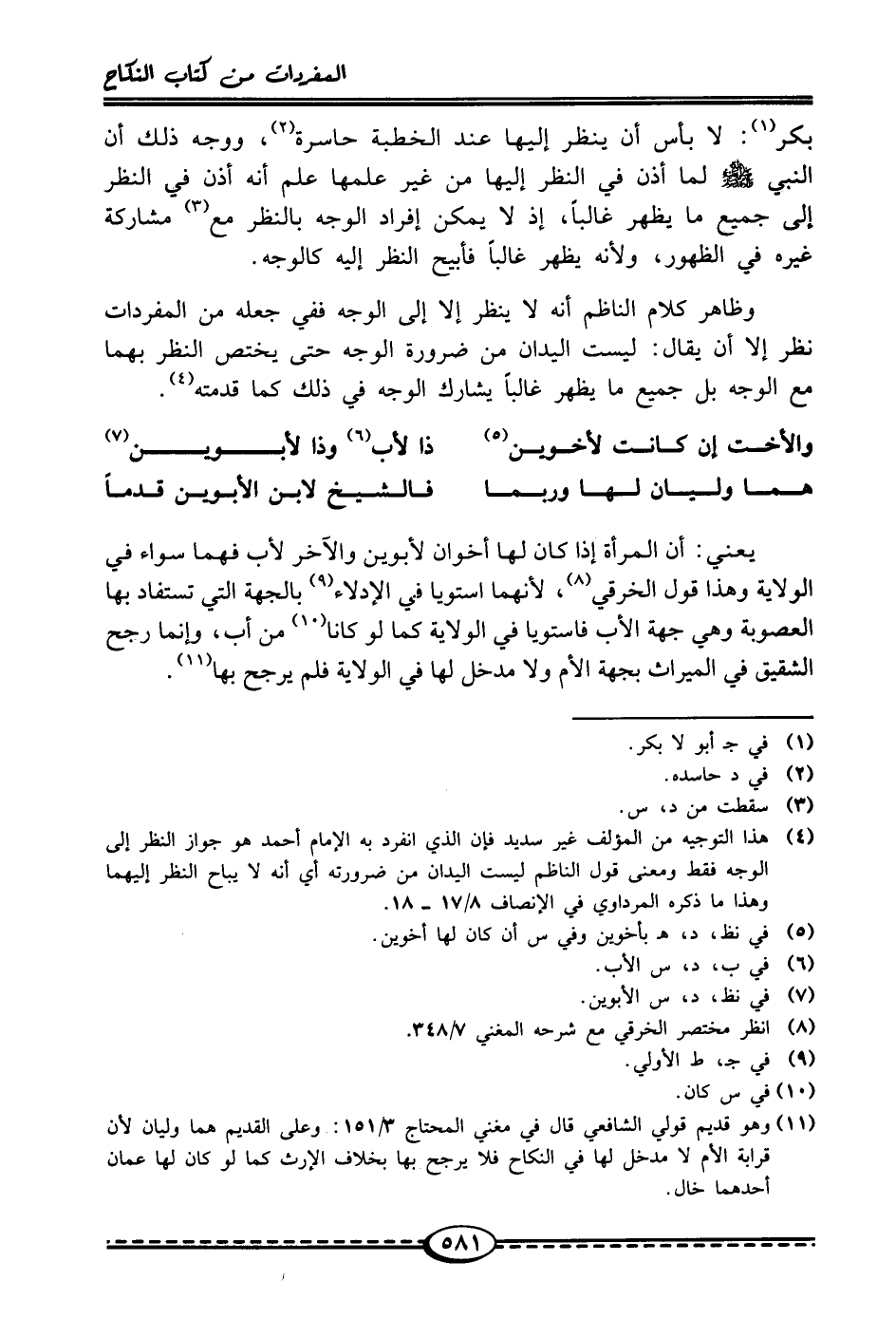 (¬4) هذا التوجيه من المؤلف غير سديد فإن الذي انفرد به الإمام أحمد هو جواز النظر إلى الوجه فقط ومعنى قول الناظم ليست اليدان من ضرورته أي أنه لا يباح النظر إليهما وهذا ما ذكره المرداوي في الإنصاف 8/ 17 - 18.