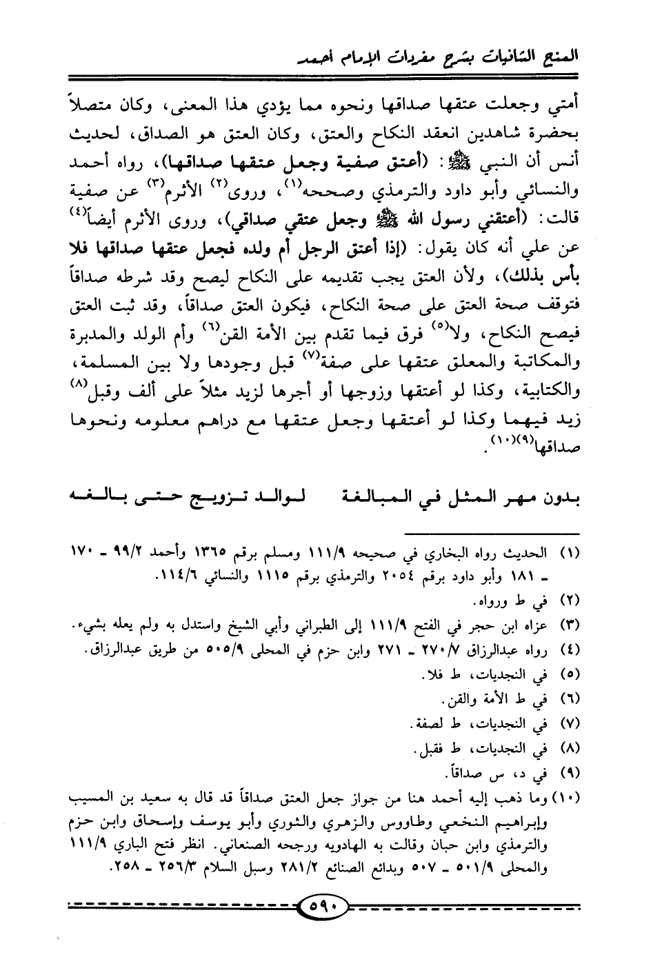 (¬10) وما ذهب إليه أحمد هنا من جواز جعل العتق صداقًا قد قال به سعيد بن المسيب لإبراهيم النخعي وطاووس والزهري والثوري وأبو يوسف وإسحاق وابن حزم والترمذيُّ وابن حبان وقالت به الهادويه ورجحه الصنعاني. انظر فتح الباري 9/ 111 والمحلى 9/ 501 - 507 وبدائع الصنائع 2/ 281 وسبل السلام 3/ 256 - 258.