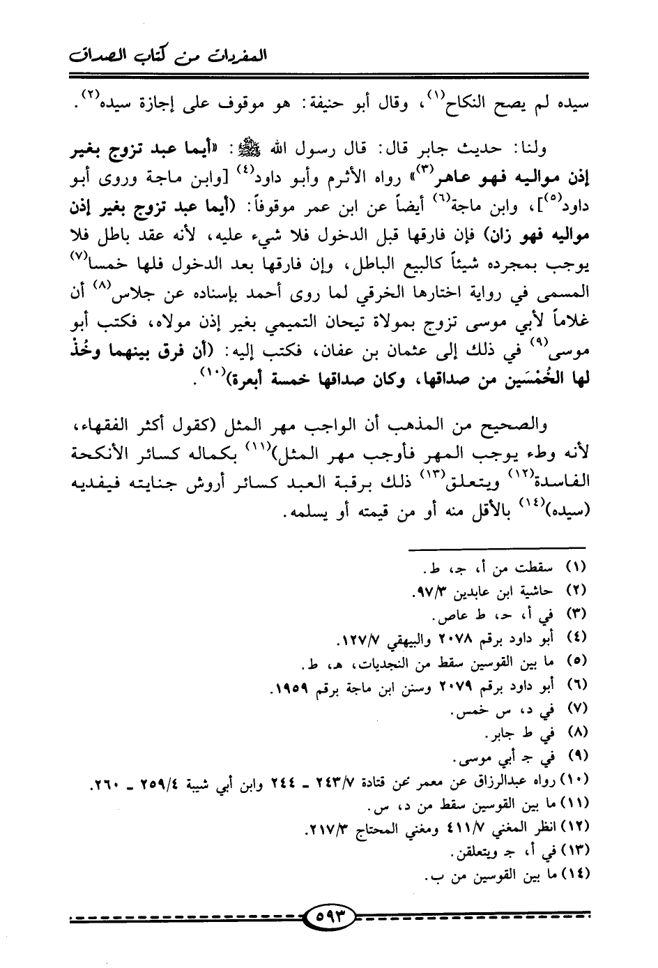 ولنا: حديث جابر قال: قال رسول الله - صلى الله عليه وسلم -: "أيما عبد تزوج بغير إذن مواليه فهو عاهر (¬3) " رواه الأثرم وأبو داود (¬4) [وابن ماجة وروى أبو داود (¬5)]، وابن ماجة (¬6) أيضًا عن ابن عمر موقوفًا: (أيما عبد تزوج بغير إذن مواليه فهو زان) فإن فارقها قبل الدخول فلا شيء عليه، لأنه عقد باطل فلا يوجب بمجرده شيئًا كالبيع الباطل، وإن فارقها بعد الدخول فلها خمسا (¬7) المسمى في رواية اختارها الخرقي لما روى أحمد بإسناده عن جلاس (¬8) أن غلامًا لأبي موسى تزوج بمولاة تيحان التميمي بغير إذن مولاه، فكتب أبو موسى (¬9) في ذلك إلى عثمان بن عفان، فكتب إليه: (أن فرق بينهما وخُذْ لها الخُمْسَين من صداقها، وكان صداقها خمسة أبعرة) (¬10).