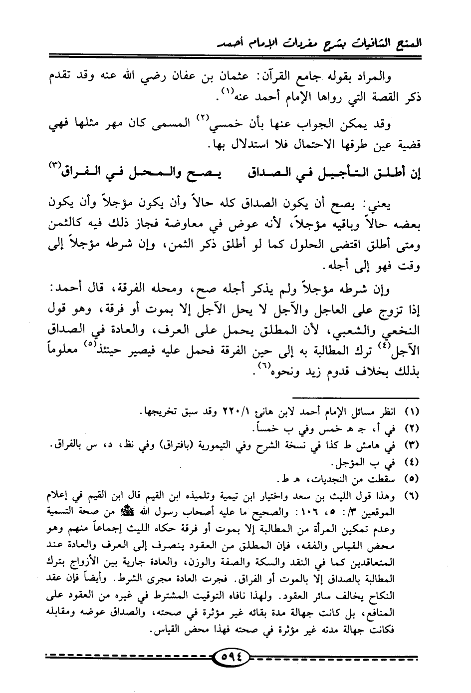 (¬6) وهذا قول الليث بن سعد واختيار ابن تيمية وتلميذه ابن القيم قال ابن القيم في إعلام الموقعين 3/ 5، 106: والصحيح ما عليه أصحاب رسول الله - صلى الله عليه وسلم - من صحة التسمية وعدم تمكين المرأة من المطالبة إلا بموت أو فرقة حكاه الليث إجماعًا منهم وهو محض القياس والفقه، فإن المطلق من العقود ينصرف إلى العرف والعادة عند المتعاقدين كما في النقد والسكة والصفة والوزن، والعادة جارية بين الأزواج بترك المطالبة بالصداق إلا بالموت أو الفراق. فجرت العادة مجرى الشرط. وأيضًا فإن عقد النكاح يخالف سائر العقود. ولهذا نافاه التوقيت المشترط في غيره من العقود على المنافع، بل كانت جهالة مدة بقائه غير مؤثرة في صحته، والصداق عوضه ومقابله فكانت جهالة مدته غير مؤثرة في صحته فهذا محض القياس.