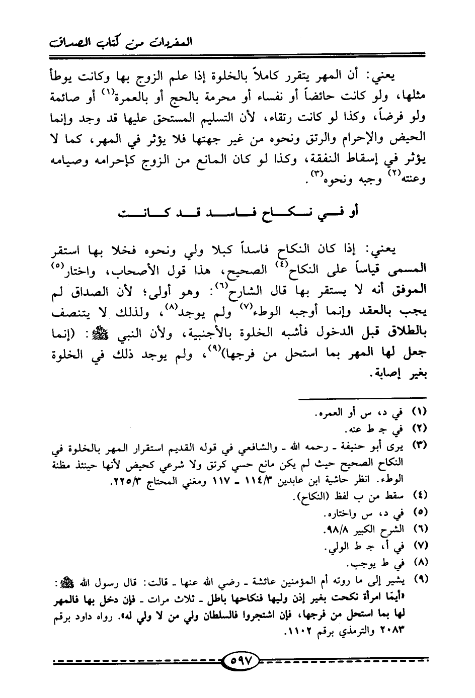 (¬9) يشير إلى ما روته أم المؤمنين عائشة -رضي الله عنها- قالت: قال رسول الله - صلى الله عليه وسلم -: "أيما امرأة نكحت بغير إذن وليها فنكاحها باطل -ثلاث مرات- فإن دخل بها فالمهر لها بما استحل من فرجها، فإن اشتجروا فالسلطان ولي من لا ولي له". رواه داود برقم 2083 والترمذيُّ برقم 1102.