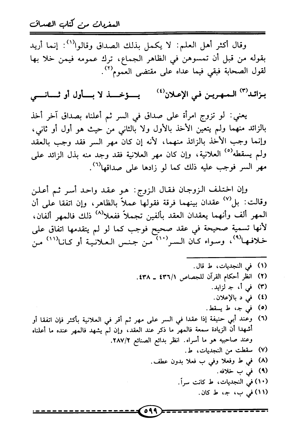 يعني: لو تزوج امرأة على صداق في السر ثم أعلناه بصداق آخر أخذ بالزائد منهما ولم يتعين الأخذ بالأول ولا بالثاني من حيث هو أول أو ثاني، وإنما وجب الأخذ بالزائد منهما، لأنه إن كان مهر السر فقد وجب بالعقد ولم يسقطه (¬5) العلانية، وإن كان مهر العلانية فقد وجد منه بذل الزائد على مهر السر فوجب عليه ذلك كما لو زادها على صداقها (¬6).