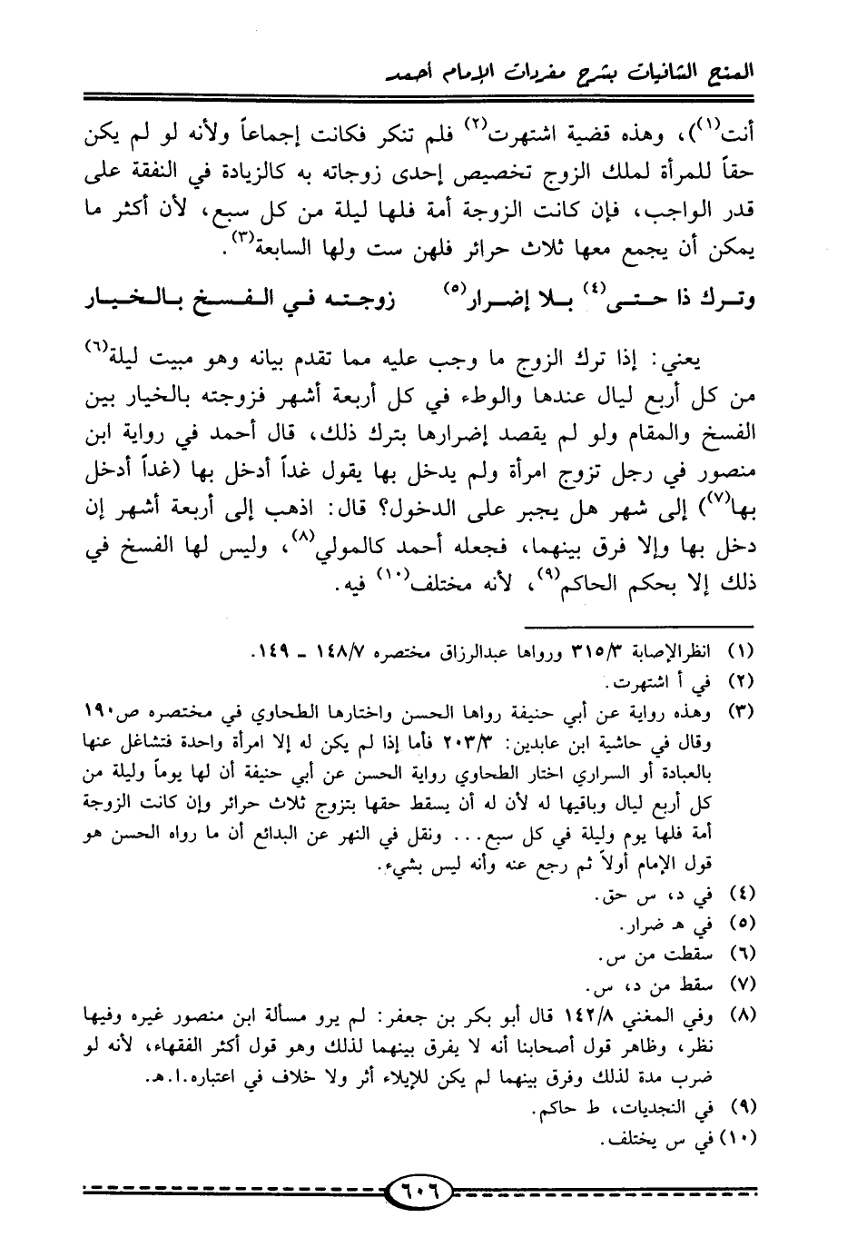 يعني: إذا ترك الزوج ما وجب عليه مما تقدم بيانه وهو مبيت ليلة (¬6) من كل أربع ليال عندها والوطء في كل أربعة أشهر فزوجته بالخيار بين الفسخ والمقام ولو لم يقصد إضرارها بترك ذلك، قال أحمد في رواية ابن منصور في رجل تزوج امرأة ولم يدخل بها يقول غدًا أدخل بها (غدًا أدخل بها (¬7)) إلى شهر هل يجبر على الدخول؟ قال: اذهب إلى أربعة أشهر إن دخل بها وإلا فرق بينهما، فجعله أحمد كالمولي (¬8)، وليس لها الفسخ في ذلك إلا بحكم الحاكم (¬9)، لأنه مختلف (¬10) فيه.