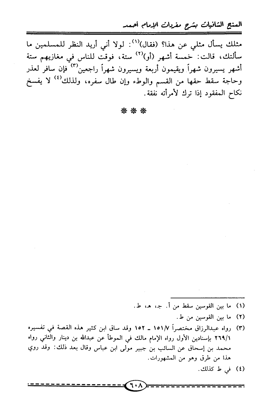 مثلك يسأل مثلي عن هذا؟ (فقال) (¬1): لولا أني أريد النظر للمسلمين ما سألتك، قالت: خمسة أشهر (أو) (¬2) ستة، فوقت للناس في مغازيهم ستة أشهر يسيرون شهرًا ويقيمون أربعة ويسيرون شهرًا راجعين (¬3) فإن سافر لعذر وحاجة سقط حقها من القسم والوطء وإن طال سفره، ولذلك (¬4) لا يفسخ نكاح المفقود إذا ترك لأمرأته نفقة.