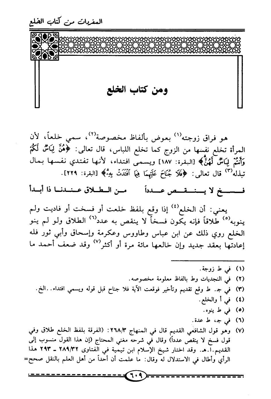 يعني: أن الخلع (¬4) إذا وقع بلفظ خلعت أو فسخت أو فاديت ولم ينوبه (¬5) طلاقًا فإنه يكون فسخًا لا ينقص به عدد (¬6) الطلاق ولو لم ينو الخلع روي ذلك عن ابن عباس وطاووس وعكرمة وإسحاق وأبي ثور فله إعادتها بعقد جديد وإن خالعها مائة مرة أو أكثر (¬7) وقد ضعف أحمد ما