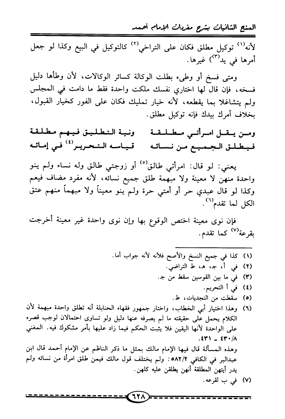 (¬6) وهذا اختيار أبي الخطاب، واختار جمهور فقهاء الحنابلة أنه تطلق واحدة مبهمة لأن الكلام يحمل على حقيقته ما لم يصرفه عنها دليل ولو تساوى احتمالان لوجب قصره على الواحدة لأنها اليقين فلا يثبت الحكم فيما زاد عليها بأمر مشكوك فيه. المغني 8/ 430 - 431.