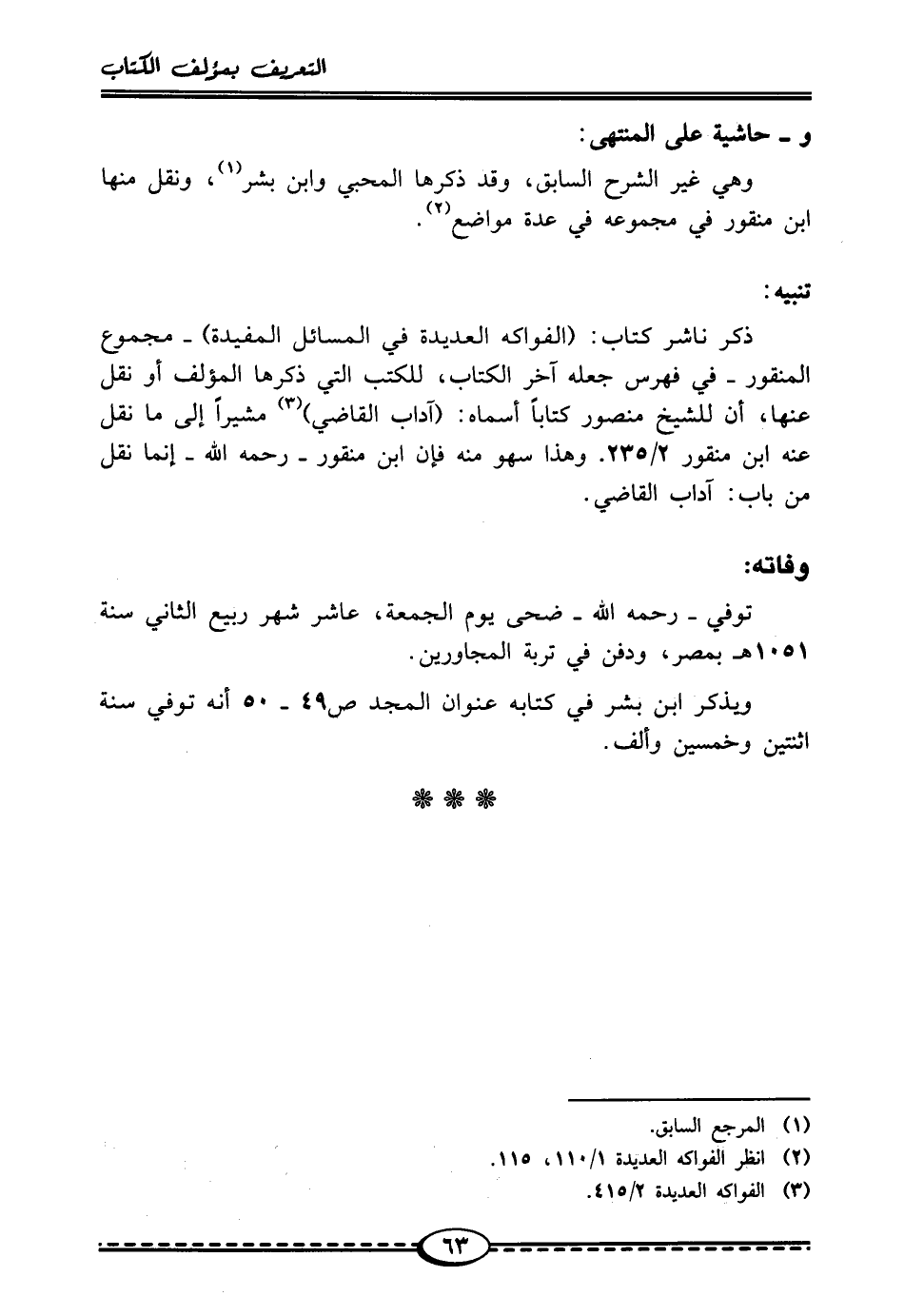 ذكر ناشر كتاب: (الفواكه العديدة في المسائل المفيدة) -مجموع المنقور- في فهرس جعله آخر الكتاب، للكتب التي ذكرها المؤلف أو نقل عنها، أن للشيخ منصور كتابًا أسماه: (آداب القاضي) (¬3) مشيرًا إلى ما نقل عنه ابن منقور 2/ 235. وهذا سهو منه فإن ابن منقور -رحمه الله- إنما نقل من باب: آداب القاضي.