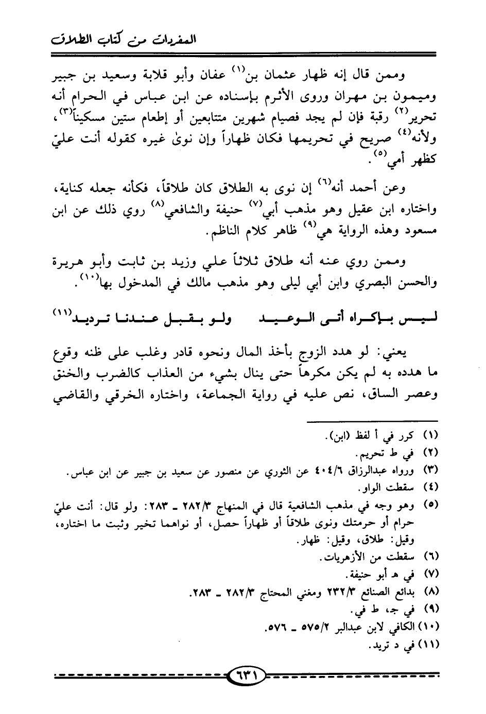 وممن روي عنه أنه طلاق ثلاثًا علي وزيد بن ثابت وأبو هريرة والحسن البصري وابن أبي ليلى وهو مذهب مالك في المدخول بها (¬10).