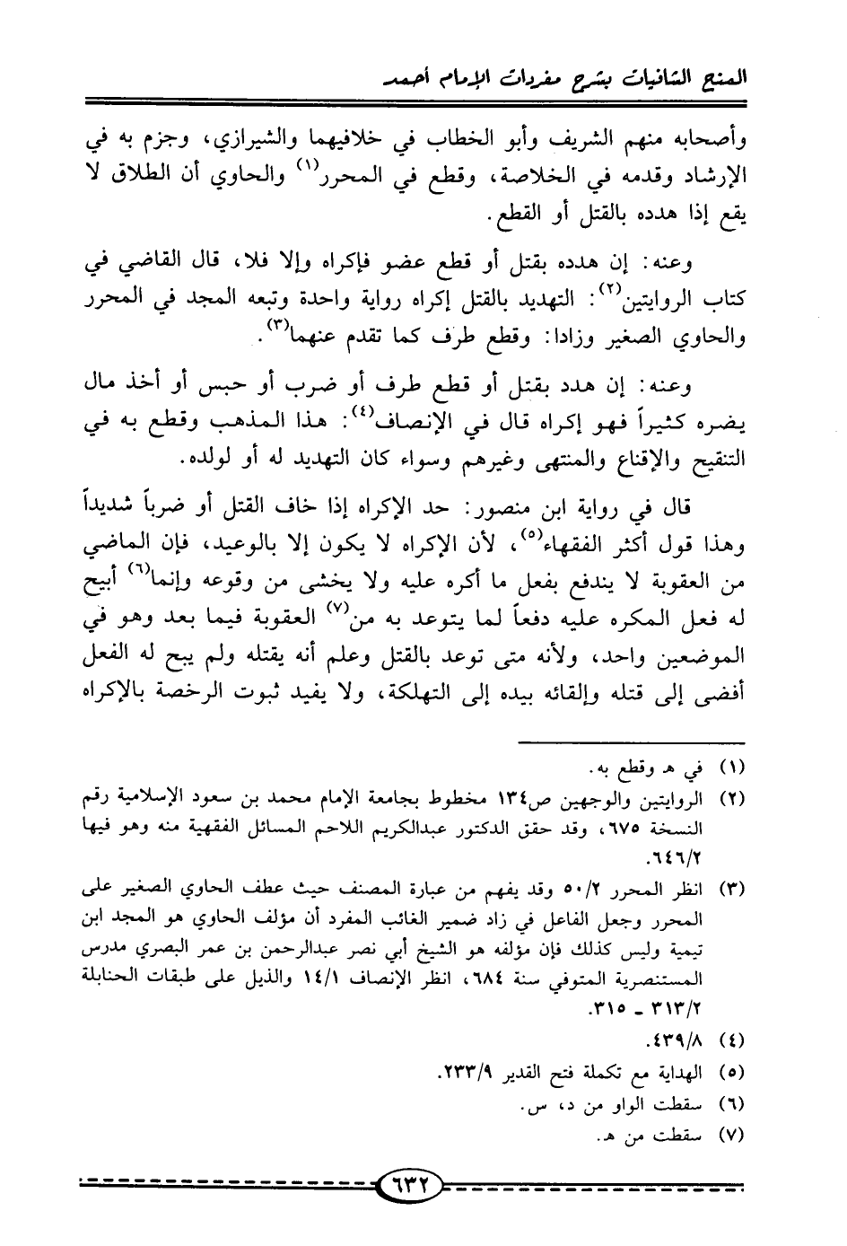 وعنه: إن هدده بقتل أو قطع عضو فإكراه وإلا فلا، قال القاضي في كتاب الروايتين (¬2): التهديد بالقتل إكراه رواية واحدة وتبعه المجد في المحرر والحاوي الصغير وزادا: وقطع طرف كما تقدم عنهما (¬3).