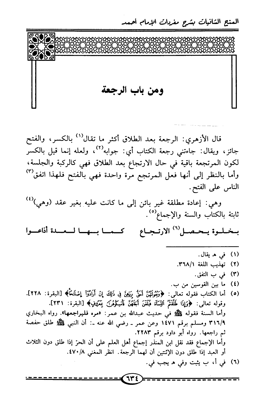 (¬5) أما الكتاب فقوله تعالى: {وَبُعُولَتُهُنَّ أَحَقُّ بِرَدِّهِنَّ فِي ذَلِكَ إِنْ أَرَادُوا إِصْلَاحًا} [البقرة: 228]. وقوله تعالى: {وَإِذَا طَلَّقْتُمُ النِّسَاءَ فَبَلَغْنَ أَجَلَهُنَّ فَأَمْسِكُوهُنَّ بِمَعْرُوفٍ} [البقرة: 231].
