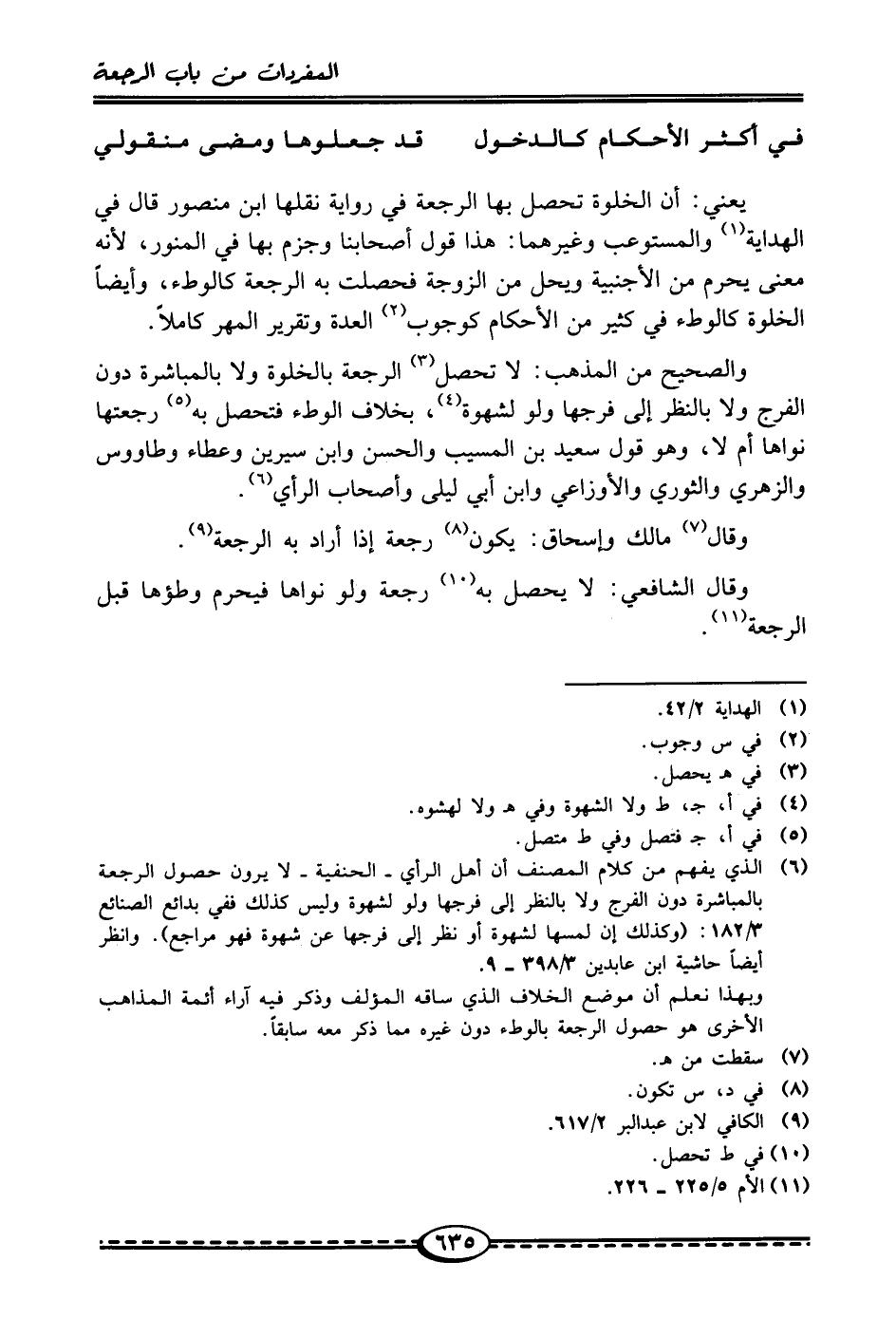 (¬6) الذي يفهم من كلام المصنف أن أهل الرأي -الحنفية- لا يرون حصول الرجعة بالمباشرة دون الفرج ولا بالنظر إلى فرجها ولو لشهوة وليس كذلك ففي بدائع الصنائع 3/ 182: (وكذلك إن لمسها لشهوة أو نظر إلى فرجها عن شهوة فهو مراجع). وانظر أيضًا حاشية ابن عابدين 3/ 398 - 9.