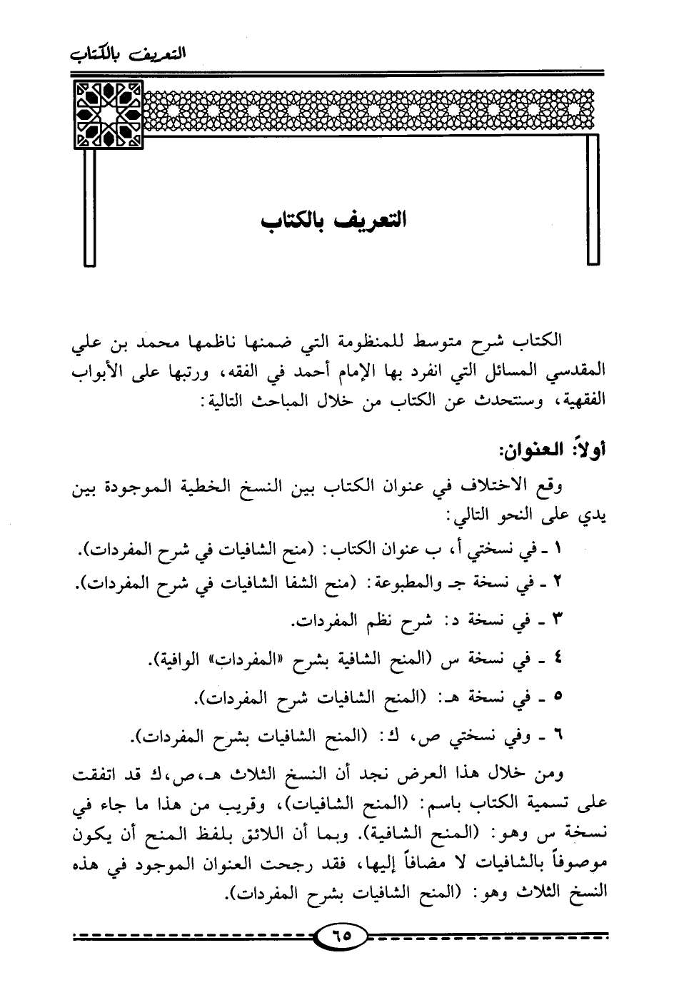 6 - وفي نسختي ص، ك: (المنح الشافيات بشرح المفردات).