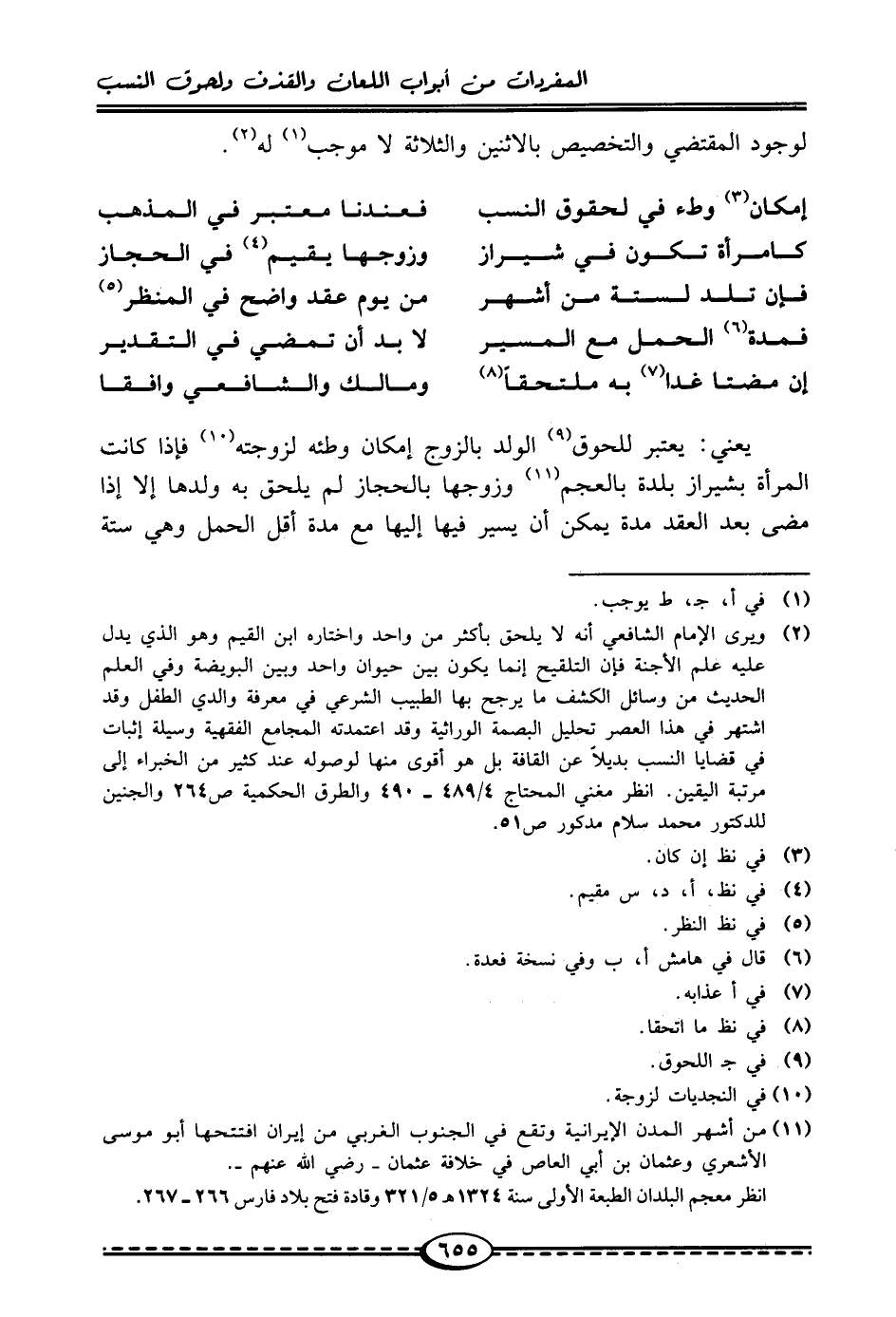 يعني: يعتبر للحوق (¬9) الولد بالزوج إمكان وطئه لزوجته (¬10) فإذا كانت المرأة بشيراز بلدة بالعجم (¬11) وزوجها بالحجاز لم يلحق به ولدها إلا إذا مضى بعد العقد مدة يمكن أن يسير فيها إليها مع مدة أقل الحمل وهي ستة