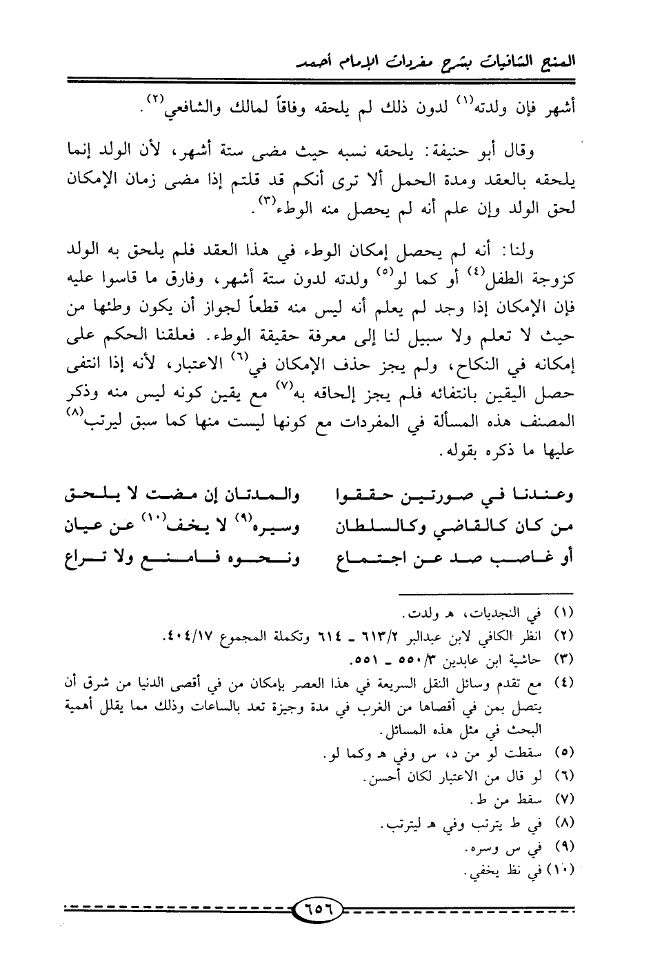 ولنا: أنه لم يحصل إمكان الوطء في هذا العقد فلم يلحق به الولد كزوجة الطفل (¬4) أو كما لو (¬5) ولدته لدون ستة أشهر، وفارق ما قاسوا عليه فإن الإمكان إذا وجد لم يعلم أنه ليس منه قطعًا لجواز أن يكون وطئها من حيث لا تعلم ولا سبيل لنا إلى معرفة حقيقة الوطء. فعلقنا الحكم على إمكانه في النكاح، ولم يجز حذف الإمكان في (¬6) الاعتبار؛ لأنه إذا انتفى حصل اليقين بانتفائه فلم يجز إلحاقه به (¬7) مع يقين كونه ليس منه وذكر المصنف هذه المسألة في المفردات مع كونها ليست منها كما سبق ليرتب (¬8) عليها ما ذكره بقوله.