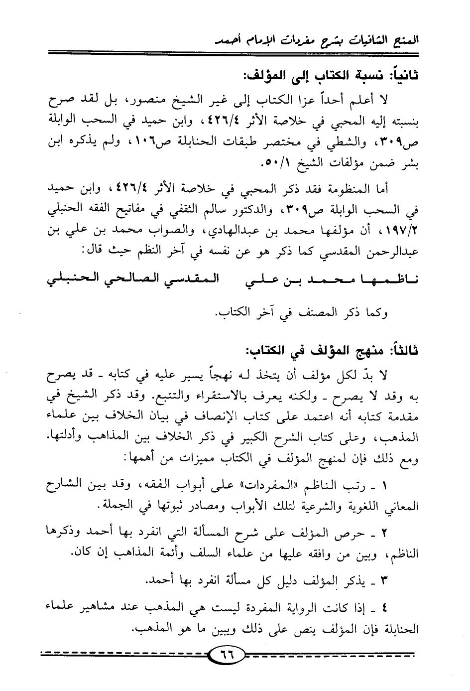 أما المنظومة فقد ذكر المحبي في خلاصة الأثر 4/ 426، وابن حميد في السحب الوابلة ص 309، والدكتور سالم الثقفي في مفاتيح الفقه الحنبلي 2/ 197، أن مؤلفها محمَّد بن عبد الهادي، والصواب محمَّد بن علي بن عبد الرحمن المقدسي كما ذكر هو عن نفسه في آخر النظم حيث قال: