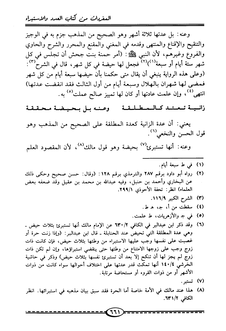 (¬6) وقد ذكر ابن عبد البر في الكافي 2/ 630 عن الإِمام مالك أنها تستبرئ بثلاث حيض -وهي عدة المطلقة التي تحيض عند الحنابلة- قال ابن عبد البر: (وإذا زنت حرة أو غصبت على نفسها وجب عليها الاستبراء من وطئها بثلاث حيض، فإن كانت ذات زوج وجب على زوجها الامتناع من وطئها حتى ينقضي استبراؤها، وإن لم تكن ذات زوج لم يجز لها أن تنكح إلا بعد أن تستبرئ نفسها بثلاث حيض) وذكر في حاشية الخرشي 4/ 140 أنها تمكث قدر عدتها على اختلاف أحوالها سواء كانت من ذوات الأشهر أو من ذوات القروء أو مستحاضة مرتابة.