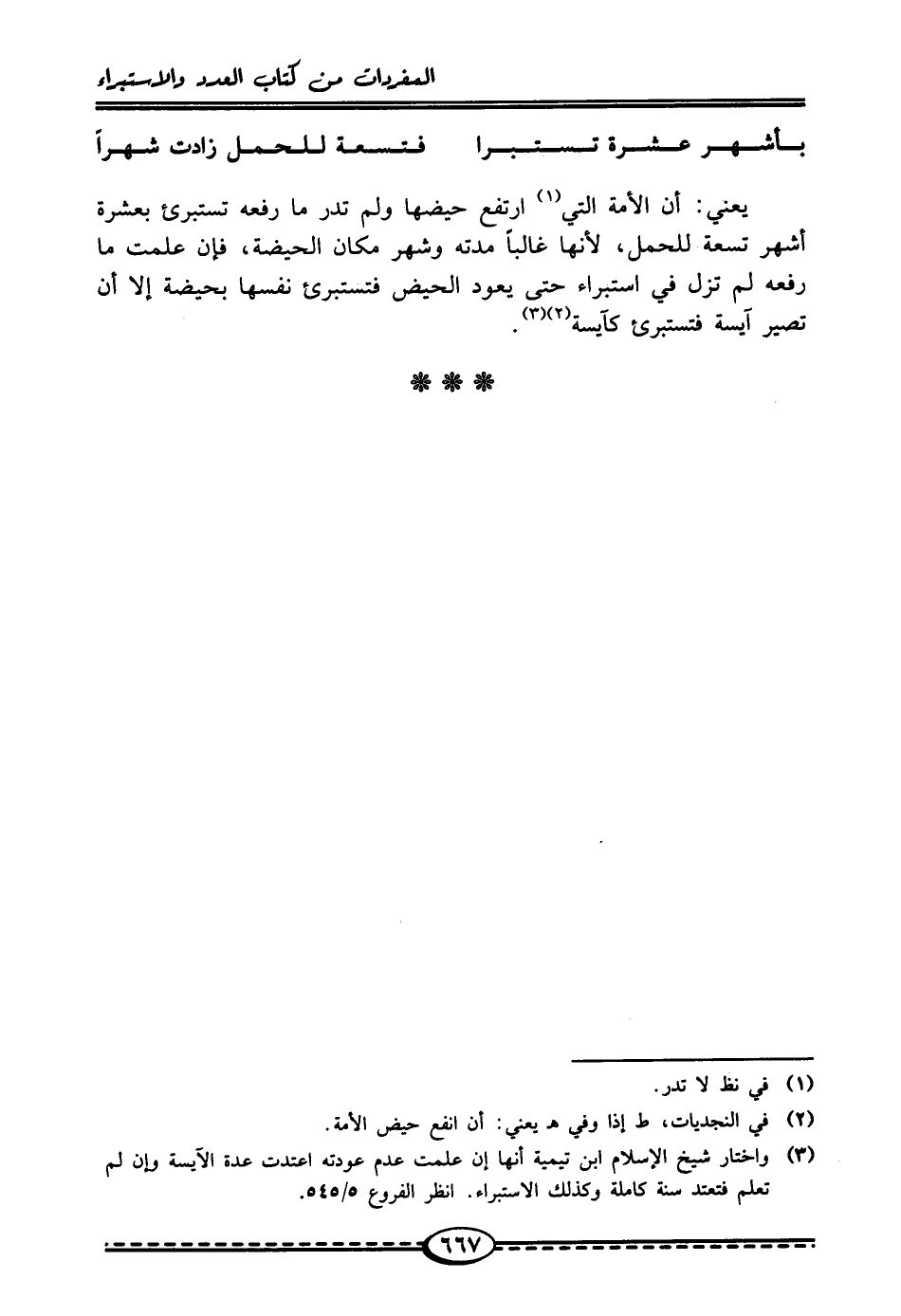 (¬3) واختار شيخ الإِسلام ابن تيمية أنها إن علمت عدم عودته اعتدت عدة الآيسة وإن لم تعلم فتعتد سنة كاملة وكذلك الاستبراء. انظر الفروع 5/ 545.