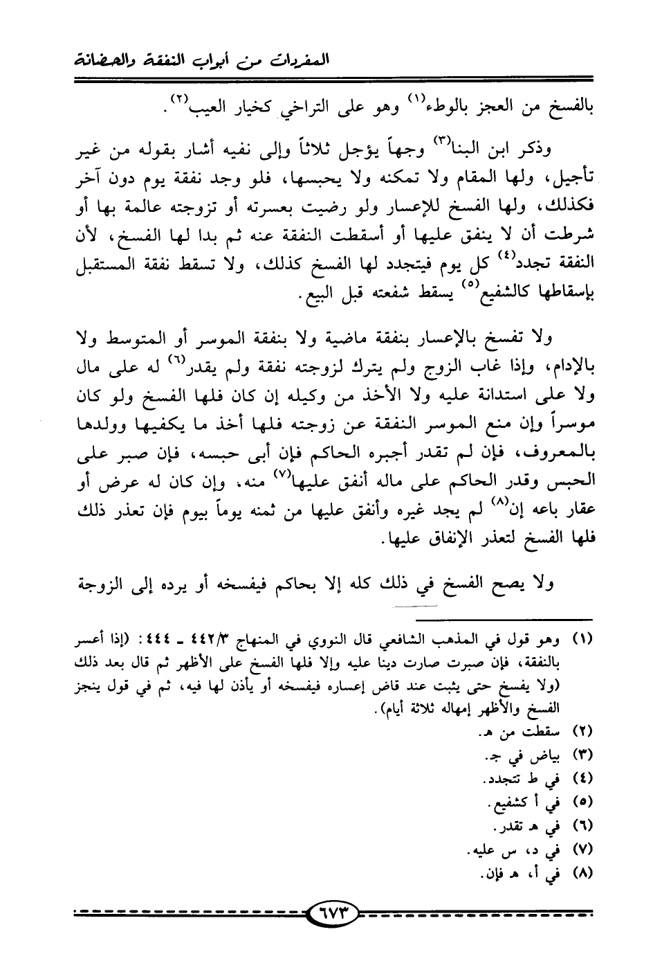 وذكر ابن البنا (¬3) وجهًا يؤجل ثلاثًا وإلى نفيه أشار بقوله من غير تأجيل، ولها المقام ولا تمكنه ولا يحبسها، فلو وجد نفقة يوم دون آخر فكذلك، ولها الفسخ للإعسار ولو رضيت بعسرته أو تزوجته عالمة بها أو شرطت أن لا ينفق عليها أو أسقطت النفقة عنه ثم بدا لها الفسخ، لأن النفقة تجدد (¬4) كل يوم فيتجدد لها الفسخ كذلك، ولا تسقط نفقة المستقبل بإسقاطها كالشفيع (¬5) يسقط شفعته قبل البيع.