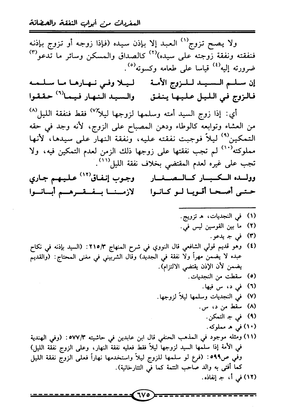 (¬11) ومثله موجود في المذهب الحنفي قال ابن عابدين في حاشيته 3/ 577: (وفي الهندية في الأمة إذا سلمها السيد لزوجها ليلًا فقط فعليه نفقة النهار، وعلى الزوج نفقة الليل) وفي ص 599: (فرع لو سلمها للزوج ليلًا واستخدمها نهارًا فعلى الزوج نفقة الليل كما أفتى به والد صاحب التتمة كما في التتارخانية).
