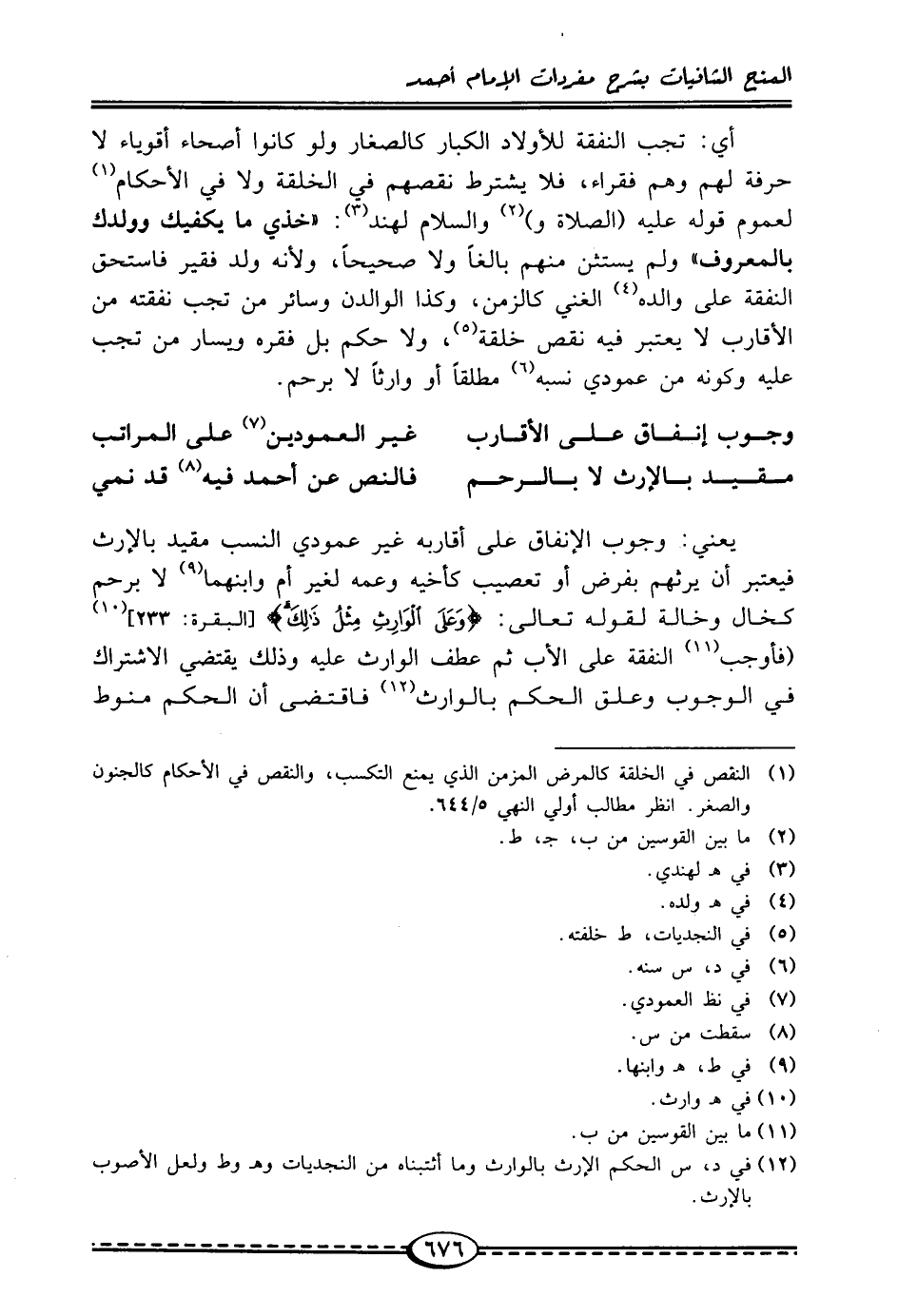 يعني: وجوب الإنفاق على أقاربه غير عمودي النسب مقيد بالإرث فيعتبر أن يرثهم بفرض أو تعصيب كأخيه وعمه لغير أم وابنهما (¬9) لا برحم كخال وخالة لقوله تعالى: {وَعَلَى الْوَارِثِ مِثْلُ ذَلِكَ} [البقرة: 233] (¬10) (فأوجب (¬11) النفقة على الأب ثم عطف الوارث عليه وذلك يقتضي الاشتراك في الوجوب وعلق الحكم بالوارث (¬12) فاقتضى أن الحكم منوط