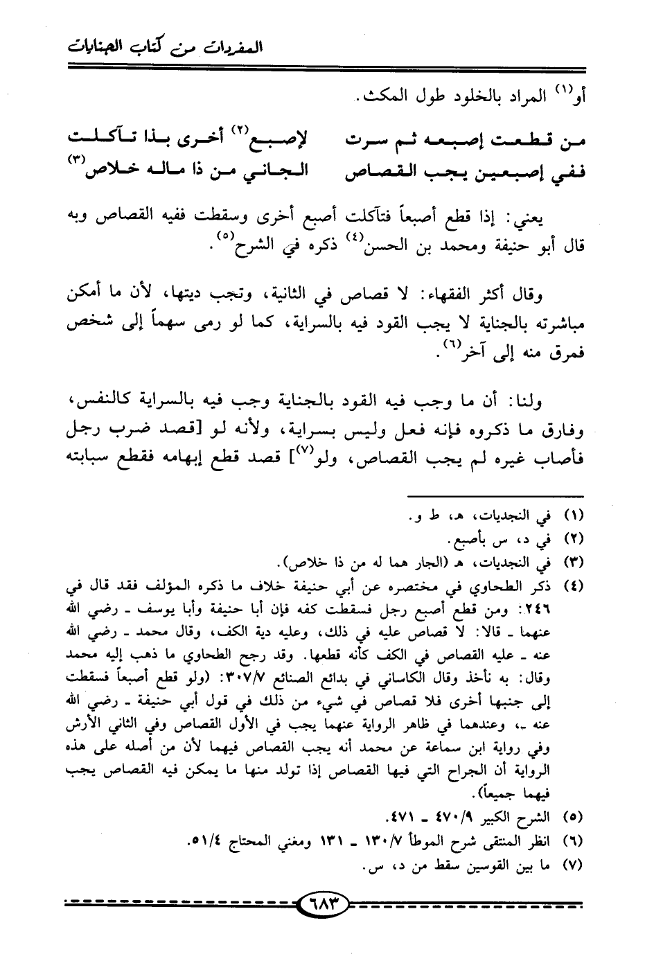 (¬4) ذكر الطحاوي في مختصره عن أبي حنيفة خلاف ما ذكره المؤلف فقد قال في 246: ومن قطع أصبع رجل فسقطت كفه فإن أبا حنيفة وأبا يوسف -رضي الله عنهما- قالا: لا قصاص عليه في ذلك، وعليه دية الكف، وقال محمَّد -رضي الله عنه- عليه القصاص في الكف كأنه قطعها. وقد رجح الطحاوي ما ذهب إليه محمَّد وقال: به نأخذ وقال الكاساني في بدائع الصنائع 7/ 307: (ولو قطع أصبعًا فسقطت إلى جنبها أخرى فلا قصاص في شيء من ذلك في قول أبي حنيفة -رضي الله عنه- وعندهما في ظاهر الرواية عنهما يجب في الأول القصاص وفي الثاني الأرش وفي رواية ابن سماعة عن محمَّد أنه يجب القصاص فيهما لأن من أصله على هذه الرواية أن الجراح التي فيها القصاص إذا تولد منها ما يمكن فيه القصاص يجب فيهما جميعًا).