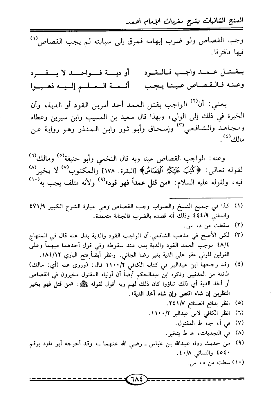 (¬3) لكن الأصح في مذهب الشافعي أن الواجب القود والدية بدل عنه قال في المنهاج 4/ 48 موجب العمد القود والدية بدل عند سقوطه وفي قول أحدهما مبهمًا وعلى القولين للولي عفو على الدية بغير رضا الجاني. وانظر أيضًا فتح الباري 12/ 184.