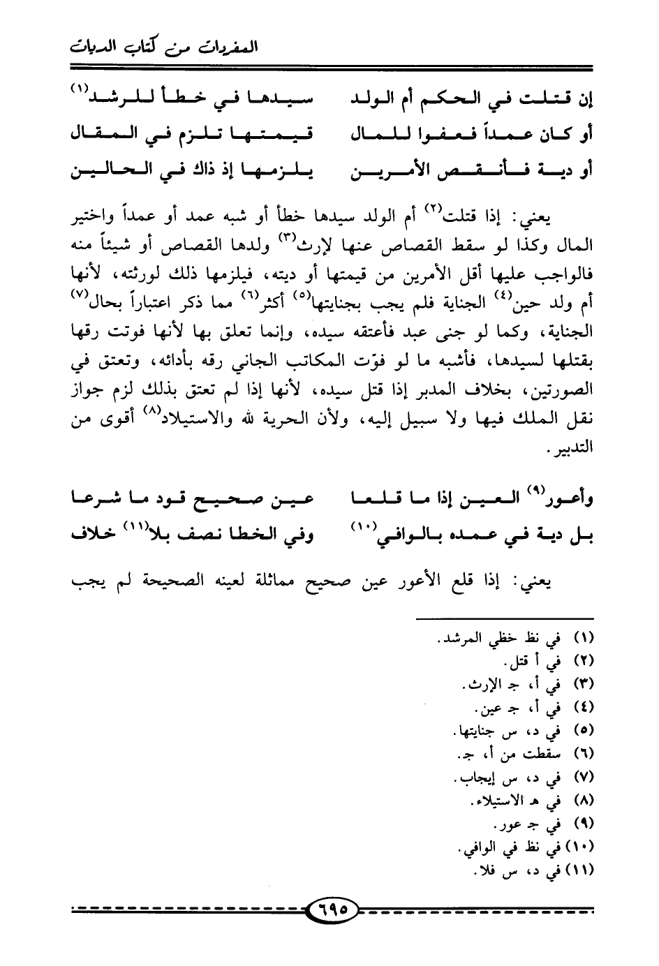 إن قتلت في الحكم أم الولد ... سيدها في خطأ للرشد (¬1)