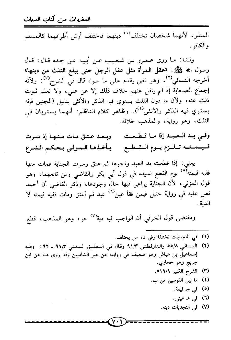 ولنا: ما روى عمرو بن شعيب عن أبيه عن جده قال: قال رسول الله - صلى الله عليه وسلم -: "عقل المرأة مثل عقل الرجل حتى يبلغ الثلث من ديتها" أخرجه النسائي (¬2)، وهو نص يقدم على ما سواه قال في الشرح (¬3): ولأنه إجماع الصحابة إذ لم ينقل عنهم خلاف ذلك إلا عن علي، ولا نعلم ثبوت ذلك عنه، ولأن ما دون الثلث يستوي فيه الذكر والأنثى بدليل (الجنين فإنه يستوي فيه الذكر والأنثى (¬4)). وظاهر كلام الناظم: أنهما يستويان في الثلث، وهو رواية، والمذهب خلافه.