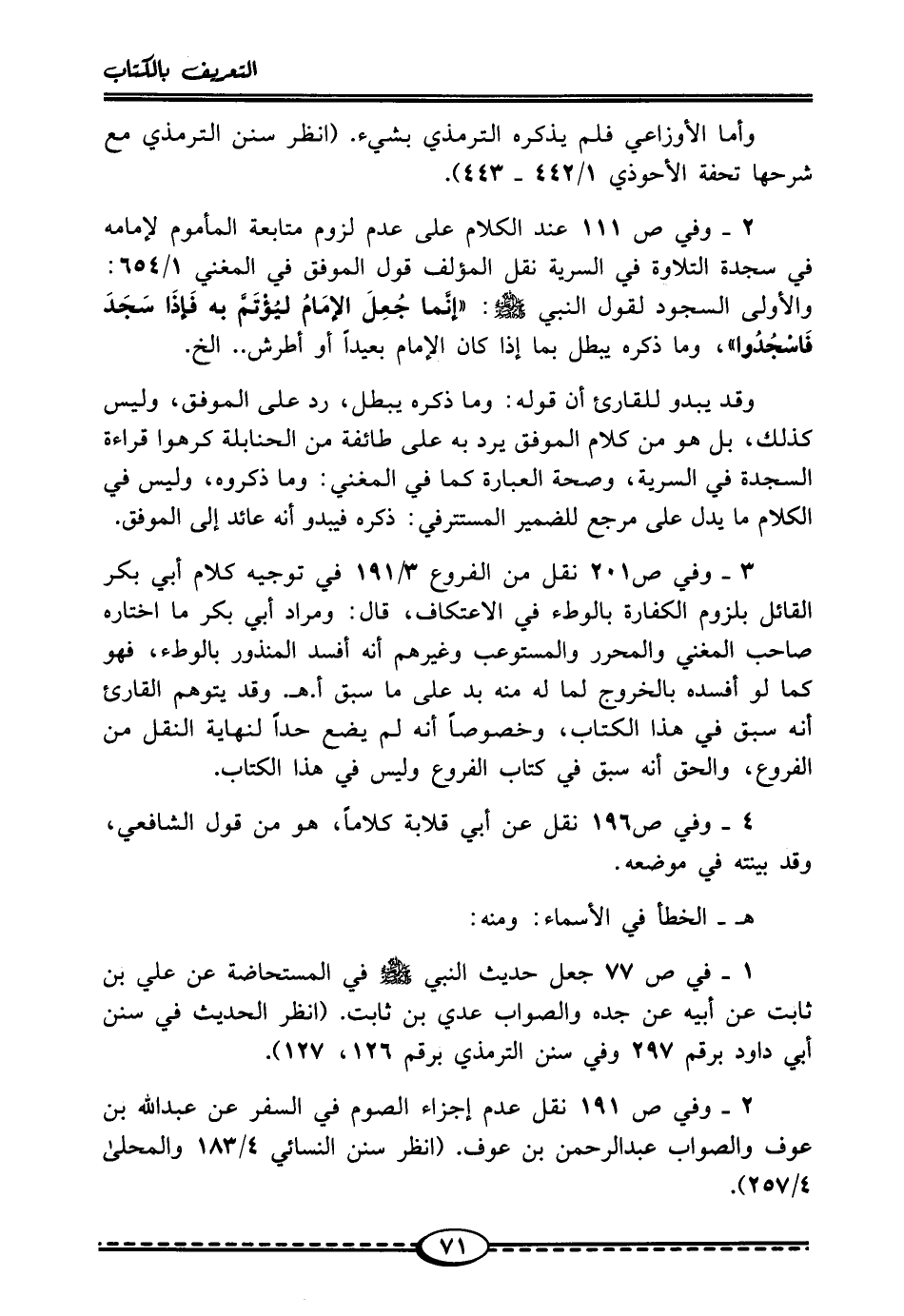 3 - وفي ص 201 نقل من الفروع 3/ 191 في توجيه كلام أبي بكر القائل بلزوم الكفارة بالوطء في الاعتكاف، قال: ومراد أبي بكر ما اختاره صاحب المغني والمحرر والمستوعب وغيرهم أنه أفسد المنذور بالوطء، فهو كما لو أفسده بالخروج لما له منه بد على ما سبق أ. هـ وقد يتوهم القارئ أنه سبق في هذا الكتاب، وخصوصًا أنه لم يضع حدًا لنهاية النقل من الفروع، والحق أنه سبق في كتاب الفروع وليس في هذا الكتاب.