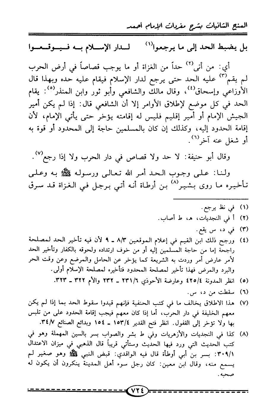 (¬7) هذا الإطلاق يخالف ما في كتب الحنفية فإنهم قيدوا سقوط الحد بما إذا لم يكن معهم الخليفة في دار الحرب، أما إذا كان معهم فيجب إقامة الحدود على من تلبس بها ولا تؤخر إلى القفول. انظر فتح القدير 4/ 153 - 154 وبدائع الصنائع 7/ 34.