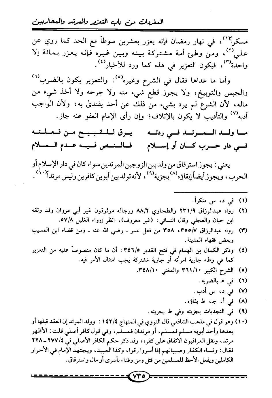مسكرًا (¬1)، في نهار رمضان فإنه يعزر بعشرين سوطًا مع الحد كما روي عن علي (¬2)، ومن وطئ أمة مشتركة بينه وبين غيره فإنه يعزر بمائة إلا واحدة (¬3)، فيكون التعزير في هذه كما ورد للأخبار (¬4).