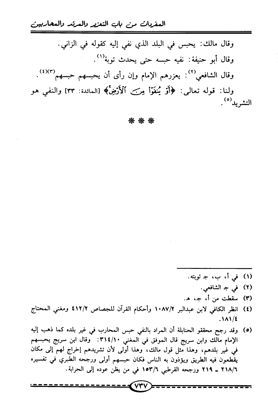 (¬5) وقد رجح محققو الحنابلة أن المراد بالنفي حبس المحارب في غير بلده كما ذهب إليه الإمام مالك وابن سريج قال الموفق في المغني 10/ 314: وقال ابن سريج يحبسهم في غير بلدهم، وهذا مثل قول مالك، وهذا أولى لأن تشريدهم إخراج لهم إلى مكان يقطعون فيه الطريق ويؤذون به الناس فكان حبسهم أولى ورجحه الطبري في تفسيره 6/ 218 - 219 ورجحه القرطبي 6/ 153 في من يظن عوده إلى الحرابة.