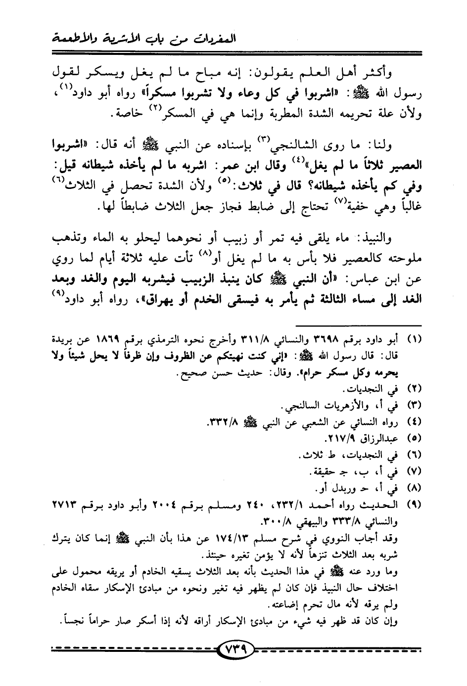 والنبيذ:- ماء يلقى فيه تمر أو زبيب أو نحوهما ليحلو به الماء وتذهب ملوحته كالعصير فلا بأس به ما لم يغل أو (¬8) تأت عليه ثلاثة أيام لما روي عن ابن عباس: "أن النبي - صلى الله عليه وسلم - كان ينبذ الزبيب فيشربه اليوم والغد وبعد الغد إلى مساء الثالثة ثم يأمر به فيسقى الخدم أو يهراق"، رواه أبو داود (¬9)