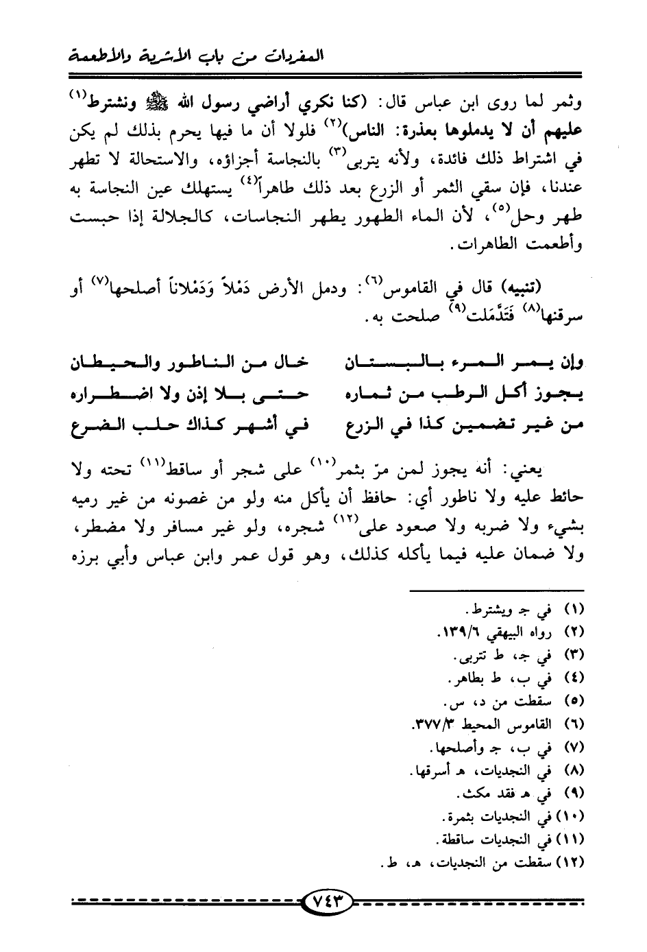 وثمر لما روى ابن عباس قال: (كنا نكري أراضي رسول الله - صلى الله عليه وسلم - ونشترط (¬1) عليهم أن لا يدملوهما بعذرة: الناس) (¬2) فلولا أن ما فيها يحرم بذلك لم يكن في اشتراط ذلك فائدة، ولأنه يتربى (¬3) بالنجاسة أجزاؤه، والاستحالة لا تطهر عندنا، فإن سقي الثمر أو الزرع بعد ذلك طاهرًا (¬4) يستهلك عين النجاسة به طهر وحل (¬5) , لأن الماء الطهور يطهر النجاسات، كالجلالة إذا حبست وأطعمت الطاهرات.