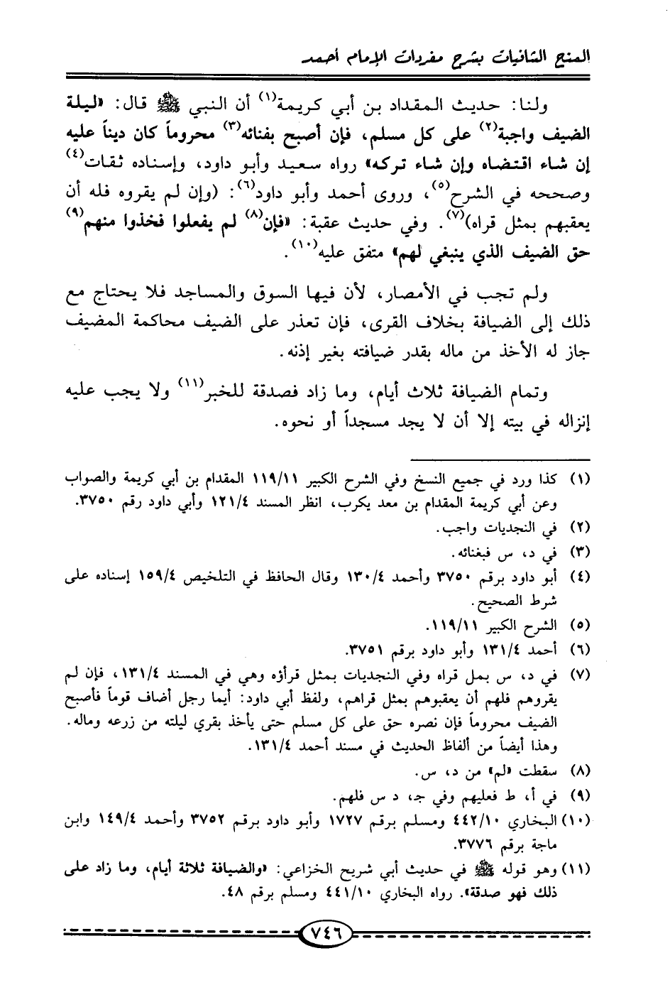 ولنا: حديث المقداد بن أبي كريمة (¬1) أن النبي - صلى الله عليه وسلم - قال: "ليلة الضيف واجبة (¬2) على كل مسلم، فإن أصبح بفنائه (¬3) محرومًا كان دينًا عليه إن شاء اقتضاه وإن شاء تركه" رواه سعيد وأبو داود، وإسناده ثقات (¬4) وصححه في الشرح (¬5)، وروى أحمد وأبو داود (¬6): (وإن لم يقروه فله أن يعقبهم بمثل قراه) (¬7). وفي حديث عقبة: "فإن (¬8) لم يفعلوا فخذوا منهم (¬9) حق الضيف الذي ينبغي لهم" متفق عليه (¬10).