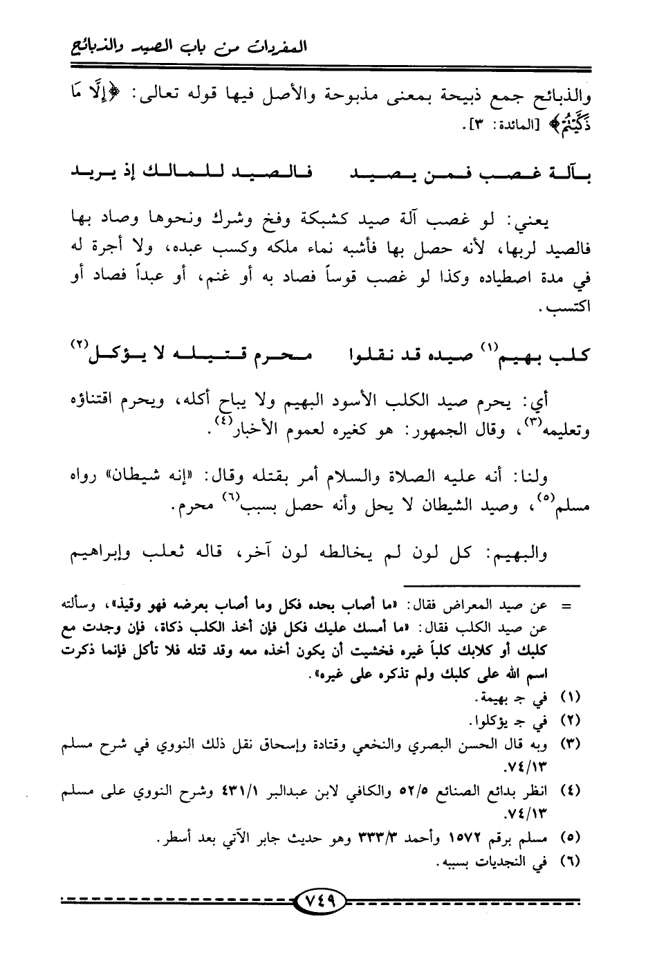 كلب بهيم (¬1) صيده قد نقلوا ... محرم قتيله لا يؤكل (¬2)