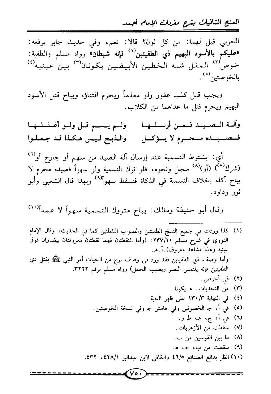 الحربيّ قيل لهما: من كلّ لون؟ قالا: نعم، وفي حديث جابر يرفعه: "عليكم بالأسود البهيم ذي الطفيتين (¬1) فإنّه شيطان" رواه مسلم والطفية: خوص (¬2) المقل شبه الخطين الأبيضين يكونان (¬3) بين عينيه (¬4) بالخوصتين (¬5).