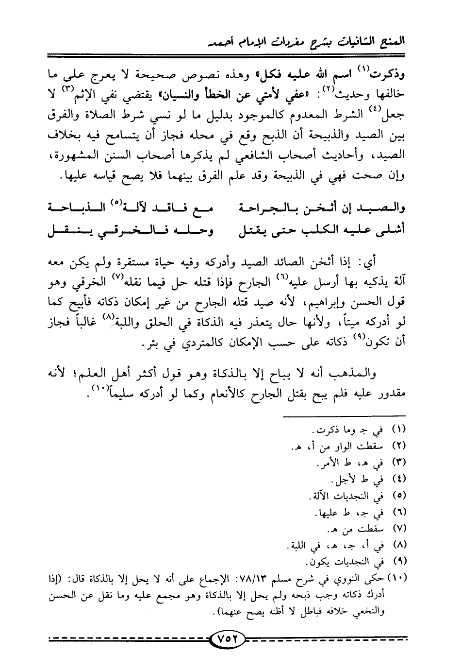 (¬10) حكى النووي في شرح مسلم 13/ 78: الإجماع على أنَّه لا يحل إِلَّا بالذَّكاة قال: (إذا أدرك ذكاته وجب ذبحه ولم يحل إِلَّا بالذَّكاة وهو مجمع عليه وما نقل عن الحسن والنخعي خلافه فباطل لا أظنه يصح عنهما).