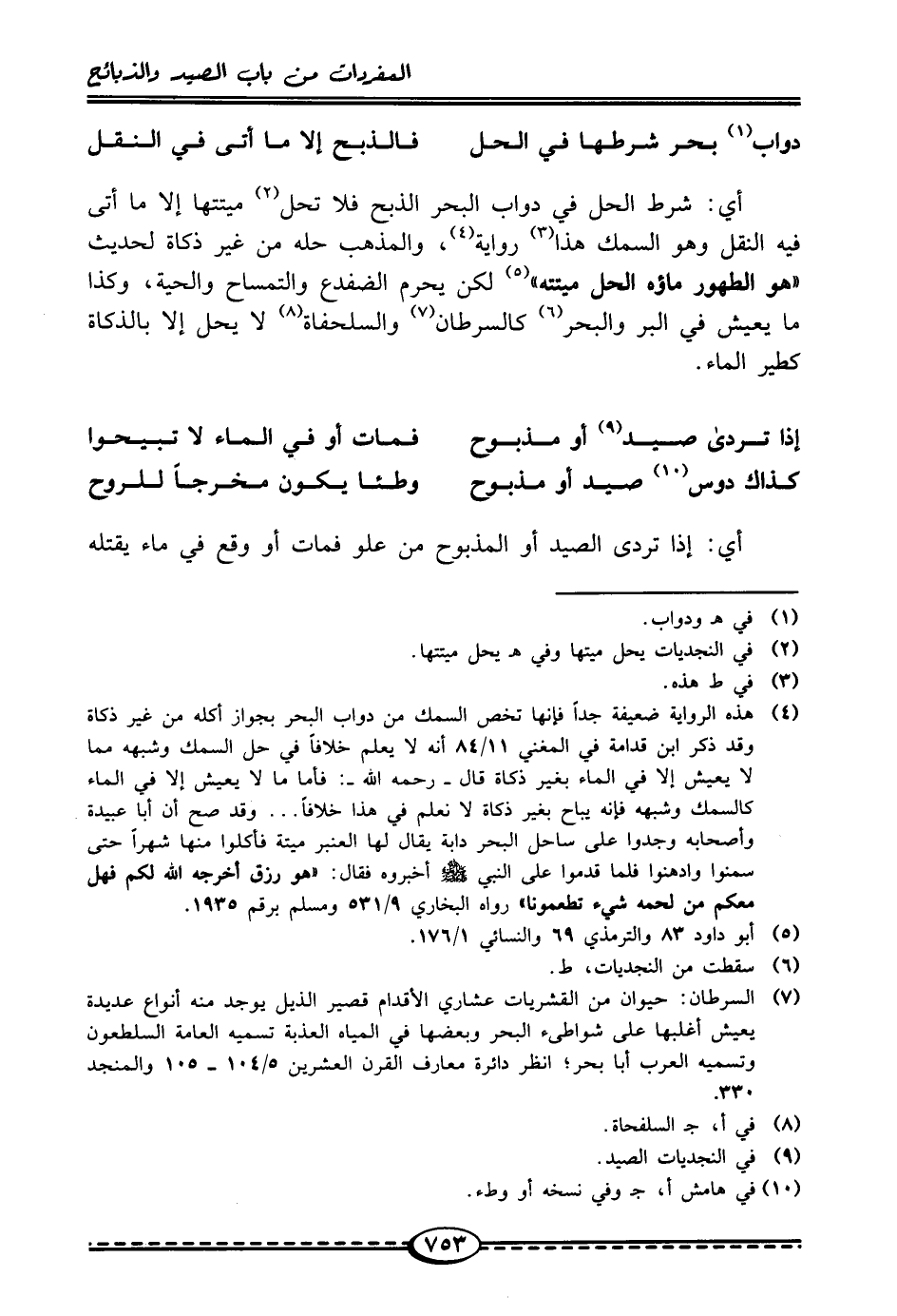 دواب (¬1) بحر شرطها في الحل ... فالذبح إِلَّا ما أن في النقل