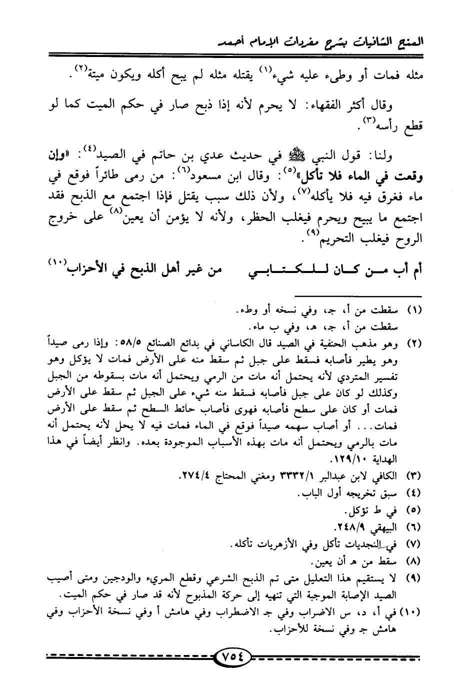(¬9) لا يستقيم هذا التعليل متى تم الذَّبح الشرعي وقطع المريء والودجين ومتى أصيب الصَّيد الإصابة الموجبة التي تنهيه إلى حركة المذبوح لأنّه قد صار في حكم الميِّت.