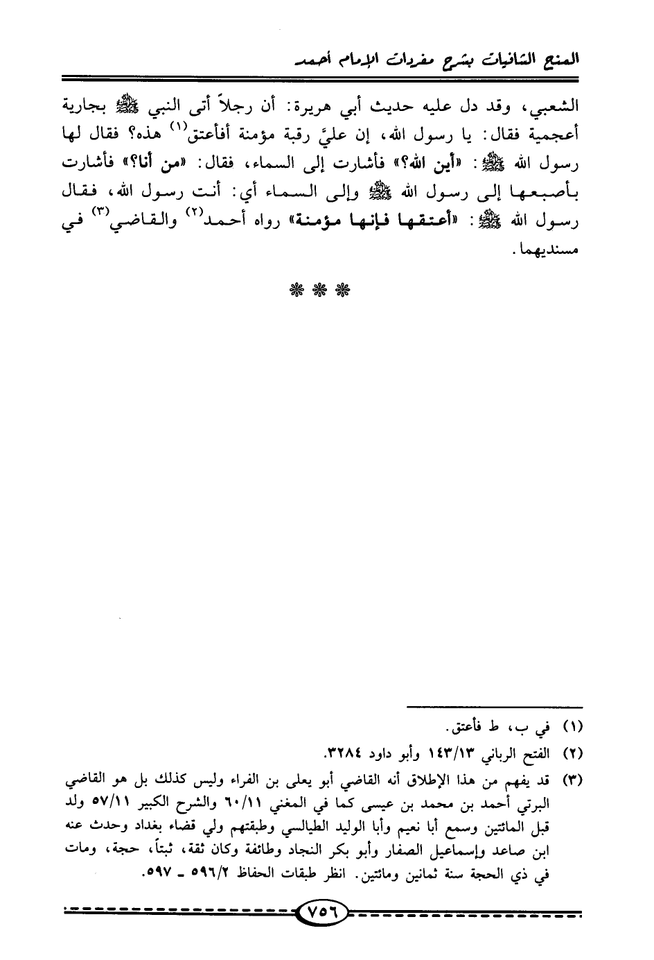 الشّعبيّ، وقد دل عليه حديث أبي هريرة: أن رجلًا أن النبي - صلى الله عليه وسلم - بجارية أعجمية فقال: يا رسول الله، إنَّ عليَّ رقبة مؤمنة أفأعتق (¬1) هذه؟ فقال لها رسول الله - صلى الله عليه وسلم -: "أين الله؟ " فأشارت إلى السَّماء، فقال: "من أنا؟ " فأشارت بأصبعها إلى رسول الله - صلى الله عليه وسلم - وإلى السَّماء أي: أنت رسول الله، فقال رسول الله - صلى الله عليه وسلم -: "أعتقها فإنها مؤمنة" رواه أحمد (¬2) والقاضي (¬3) في مسنديهما.